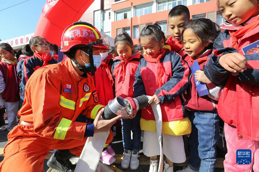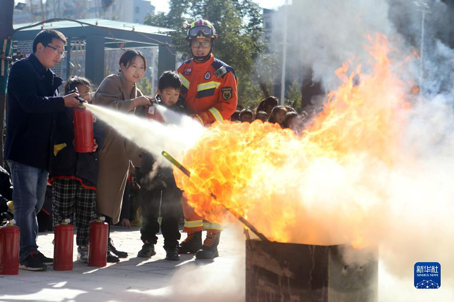 1/011月8日,在安徽省淮北市泉山路學(xué)校,師生們?cè)谙绬T的指導(dǎo)下學(xué)習(xí)滅火技能。(新華社發(fā) 萬(wàn)善朝/攝)