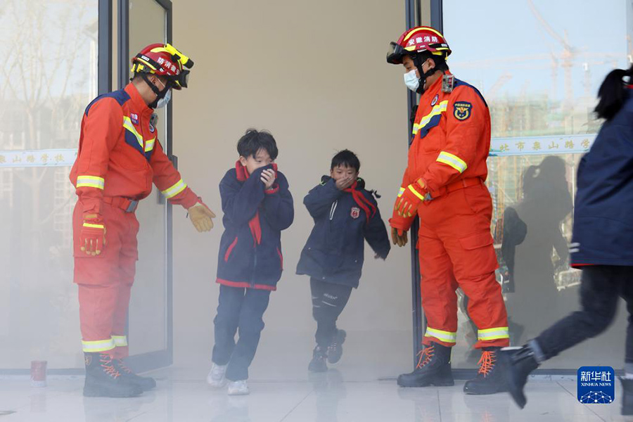 1/011月8日,在安徽省淮北市泉山路學(xué)校,學(xué)生們?cè)谙绬T的引導(dǎo)下進(jìn)行火場(chǎng)逃生演練。(新華社發(fā) 萬(wàn)善朝/攝)