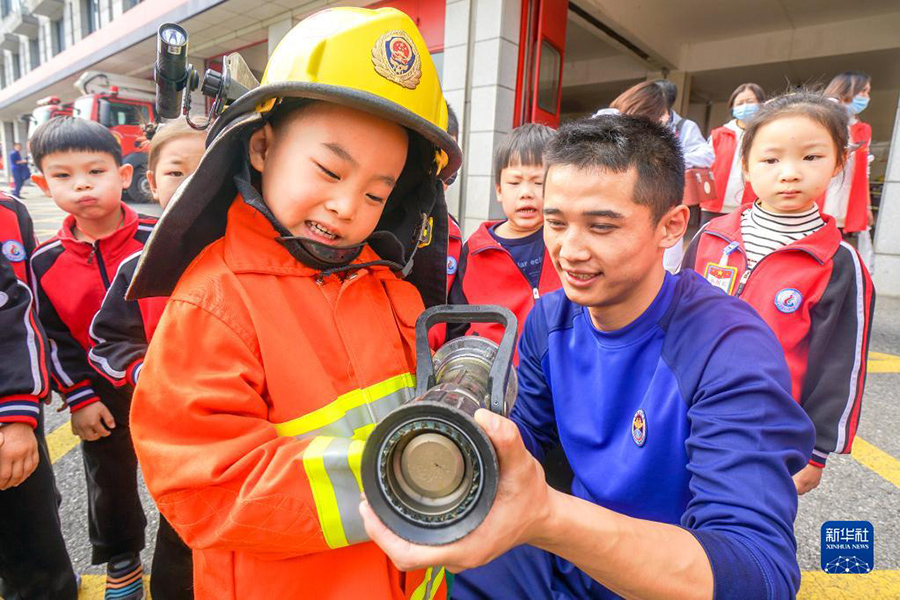 1/011月8日,浙江省湖州市長(zhǎng)興縣龍山街道中心幼兒園的小朋友穿上消防服體驗(yàn)消防水槍。(新華社發(fā) 吳拯/攝)