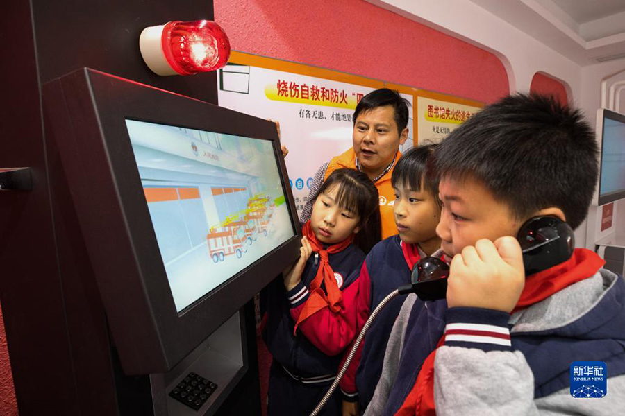 1/011月8日,在浙江省湖州市長(zhǎng)興縣實(shí)驗(yàn)小學(xué)消防館內(nèi),學(xué)生們體驗(yàn)消防報(bào)警流程。(新華社發(fā) 譚云俸/攝)