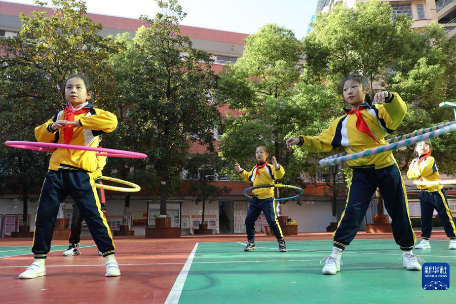 1/011月10日,衡陽(yáng)市雁峰區(qū)環(huán)城南路小學(xué)的同學(xué)在玩呼啦圈。(新華社發(fā) 周仲輝/攝)