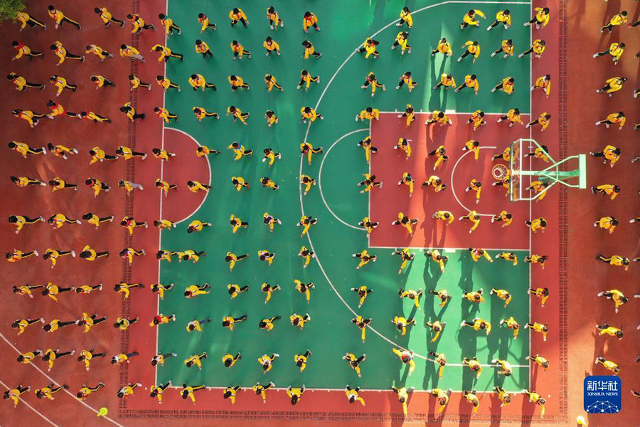 1/011月10日,衡陽(yáng)市雁峰區(qū)環(huán)城南路小學(xué)的同學(xué)在做《國(guó)學(xué)武術(shù)操》(無(wú)人機(jī)照片)。(新華社發(fā) 周仲輝/攝)