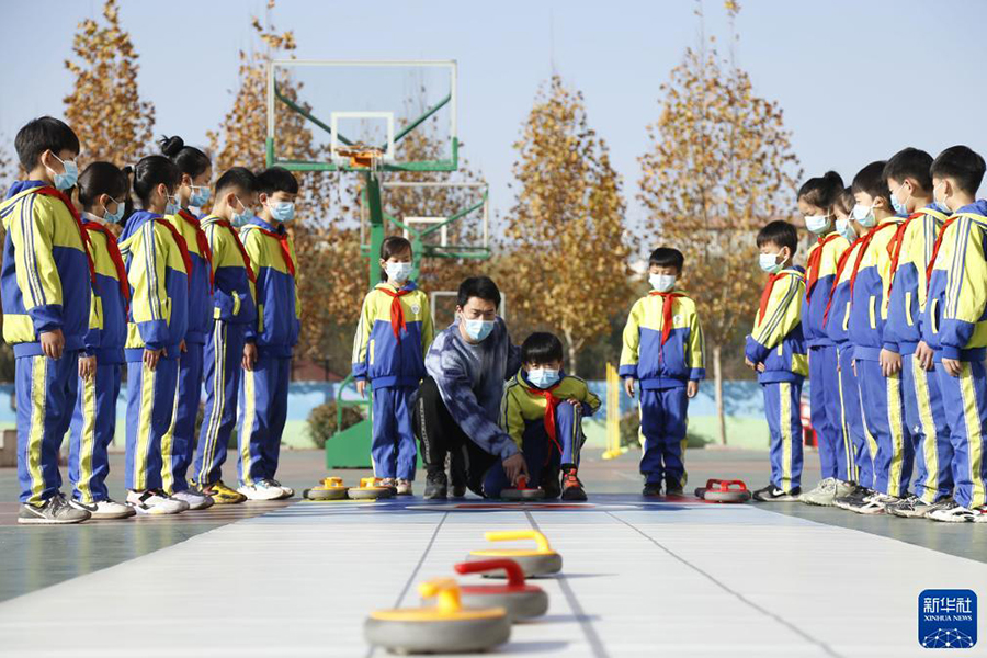 1/011月24日,邢臺市立德小學(xué)教師在指導(dǎo)學(xué)生練習(xí)冰壺。(新華社發(fā) 張馳/攝)