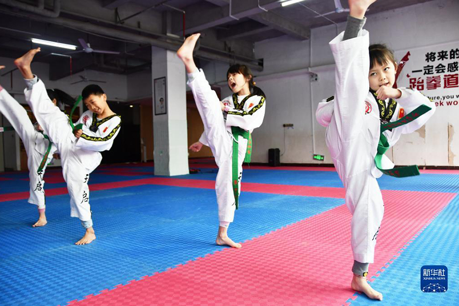 1/01月18日,孩子們在湖南省永州市江永縣一家跆拳道館學習跆拳道。(新華社發(fā) 田如瑞/攝)
