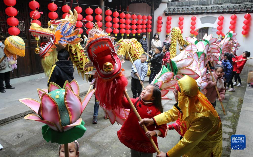 1/01月19日,在浙江省湖州市德清縣乾元鎮(zhèn)新時代文明實踐站,孩子們在學習舞龍。(新華社發(fā) 倪立芳/攝)