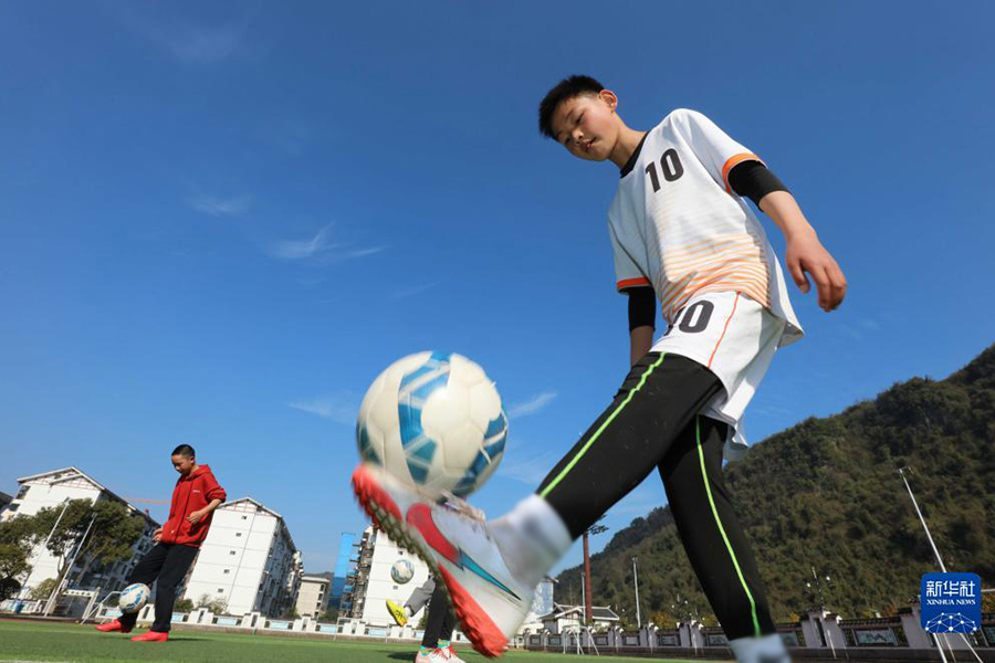 1/01月19日,湖南張家界市武陵源區(qū)的小朋友練習足球。(新華社發(fā) 吳勇兵/攝)