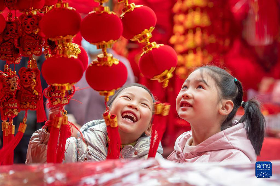 1/01月27日,小朋友在湖南省道縣城區(qū)一年集市場上挑選年貨。(新華社發(fā) 蔣克青/攝)