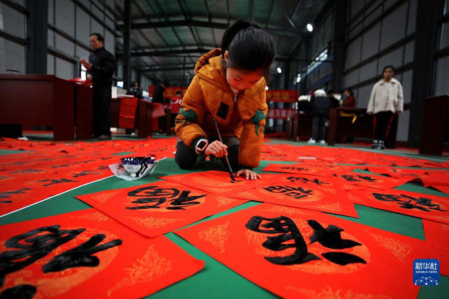 1/01月27日,青少年書法愛好者在江西省宜春市靖安縣水口鄉(xiāng)體育館書寫福字、春聯(lián)。(新華社發(fā) 徐仲庭/攝)