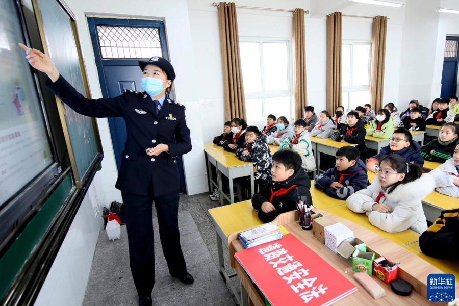 1/02月17日,河南省洛陽市汝陽縣公安局城關(guān)派出所民警在汝陽縣外國語小學(xué)開學(xué)第一課上給學(xué)生們講解道路交通安全法規(guī)。(新華社發(fā) 康紅軍/攝)