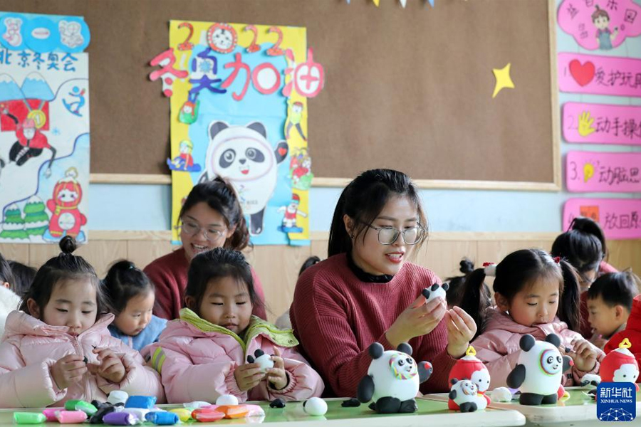 1/02月17日,四川省遂寧市順城街幼兒園開展“萌娃慶冬奧 我來捏冰墩墩”開學(xué)第一課主題活動(dòng)。(新華社發(fā) 劉昌松/攝)