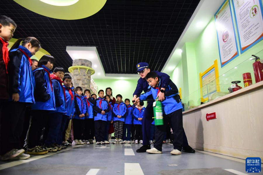 1/02月17日,浙江省建德市壽昌第一小學(xué)開展“安全教育 牢記于心”為主題的開學(xué)第一課消防安全知識(shí)教育活動(dòng)。這是消防員在消防科普體驗(yàn)館里向?qū)W生講解如何正確使用滅火器。(新華社發(fā) 寧文武/攝)