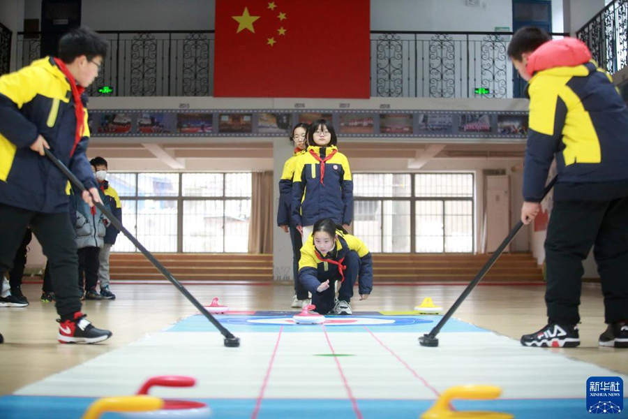 1/02月17日,江蘇省揚(yáng)州市育才小學(xué)開展“奧運(yùn)精神伴成長 我們一起向未來”開學(xué)第一課活動(dòng)。這是學(xué)生們?cè)隗w驗(yàn)旱地冰壺運(yùn)動(dòng)。(新華社發(fā) 孟德龍/攝)