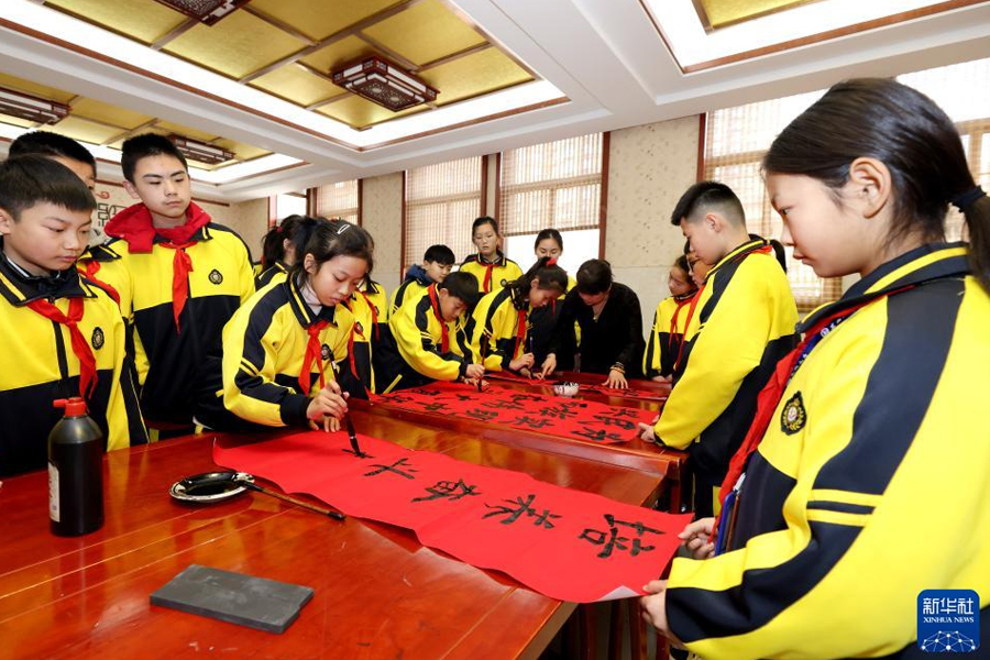 1/02月17日,在山東省棗莊市東湖小學(xué),愛好書法的學(xué)生向同學(xué)們展示在寒假期間學(xué)到的書法技藝。(新華社發(fā) 孫中喆/攝)