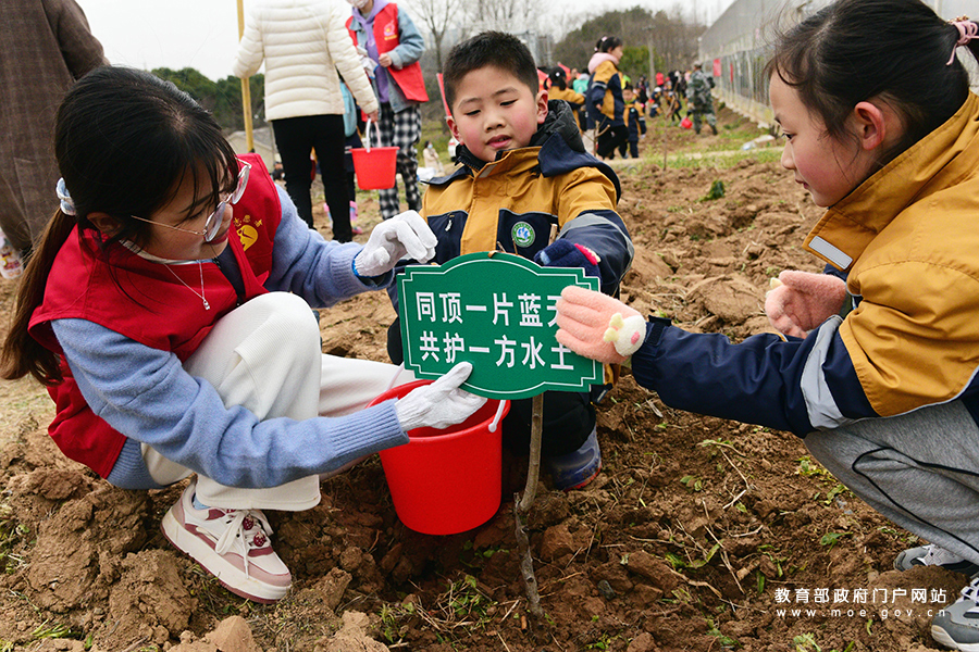 1/03月6日,江蘇科技大學(xué)志愿者和鎮(zhèn)江市實(shí)驗(yàn)小學(xué)的學(xué)生一起植樹(shù)。當(dāng)日,江蘇省鎮(zhèn)江市南山街道回龍社區(qū)聯(lián)合江蘇科技大學(xué)志愿者和鎮(zhèn)江市實(shí)驗(yàn)小學(xué)的學(xué)生開(kāi)展“春到三月 植樹(shù)護(hù)綠”活動(dòng)。志愿者和小朋友一起植樹(shù),并掛上護(hù)綠牌認(rèn)養(yǎng)小樹(shù),共同守護(hù)綠色家園。(石玉成/攝)