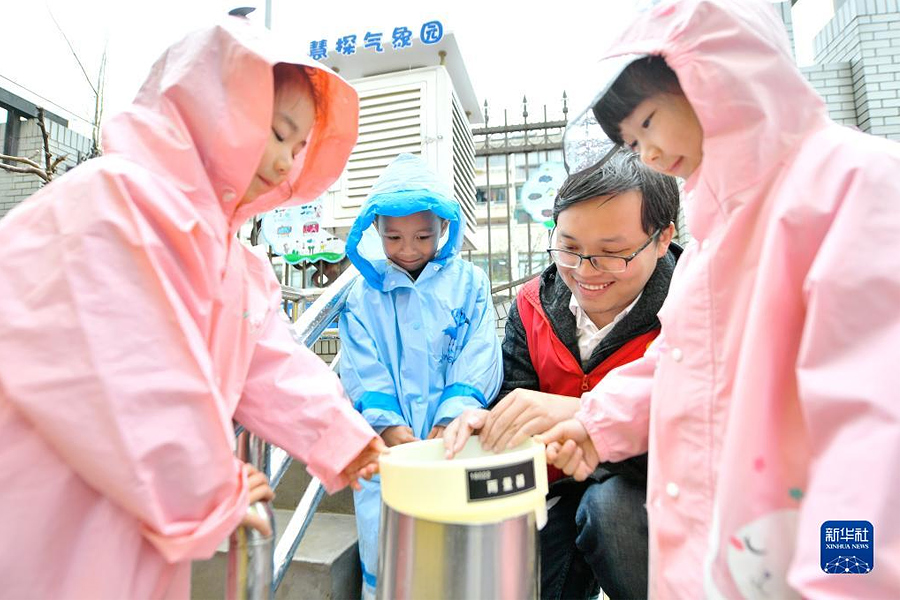 1/03月22日,在浙江省湖州市長(zhǎng)興縣開(kāi)發(fā)區(qū)實(shí)驗(yàn)幼兒園,孩子們?cè)跉庀罂破罩驹刚咧笇?dǎo)下通過(guò)雨量筒觀測(cè)降水量。(新華社發(fā) 譚云俸/攝)