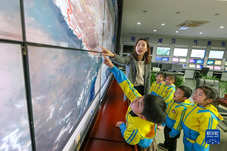 1/03月22日,工作人員在貴州省銅仁市玉屏侗族自治縣氣象局向小朋友介紹氣象知識(shí)。(新華社發(fā) 胡攀學(xué)/攝)