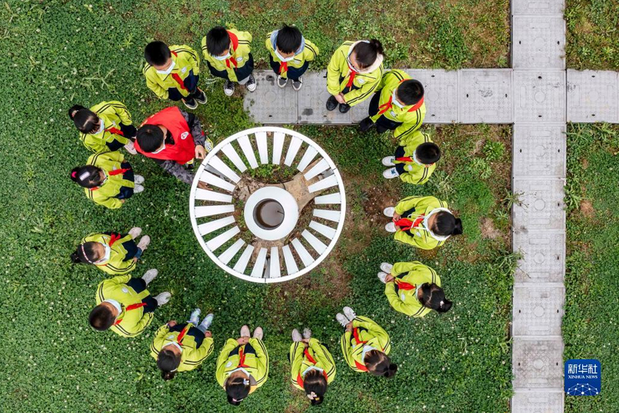 1/03月22日,學(xué)生在貴州省黔西市氣象局參觀稱重式降水觀測(cè)儀(無(wú)人機(jī)照片)。(新華社發(fā) 范暉/攝)