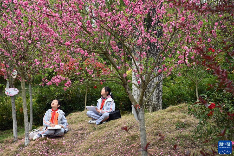 1/03月31日,嵐皋縣城關(guān)第二小學(xué)的學(xué)生在巴山珍稀植物園寫(xiě)生。(新華社記者 陶明/攝)