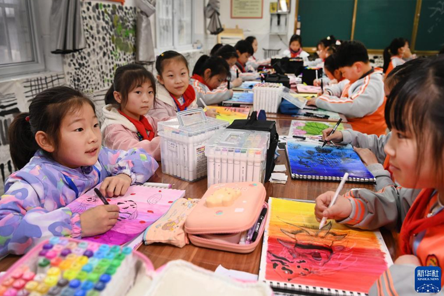 1/03月31日,嵐皋縣城關(guān)第二小學(xué)的學(xué)生在美術(shù)活動(dòng)室繪畫(huà)。(新華社記者 陶明/攝)