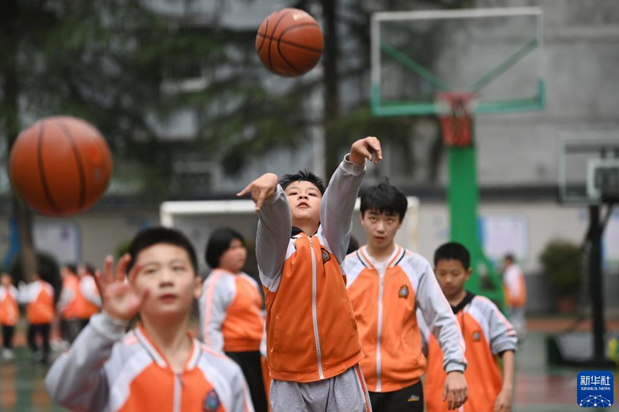 1/03月31日,嵐皋縣城關(guān)第二小學(xué)的學(xué)生在校園里進(jìn)行籃球訓(xùn)練。(新華社記者 陶明/攝)