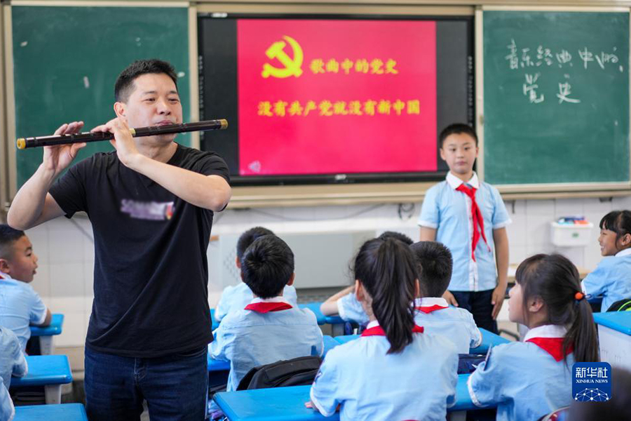 5月5日,在重慶市九龍坡區(qū)鐵路小學五年級一班的課堂上,音樂老師為學生們吹奏紅色經典樂曲《沒有共產黨就沒有新中國》。(新華社記者 劉潺/攝)