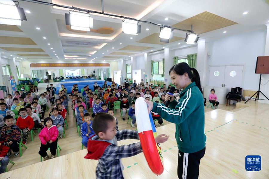 1/05月13日,在湖南省資興市幼兒園,老師為小朋友們講解防溺水安全急救方法。(新華社發(fā) 李科/攝)