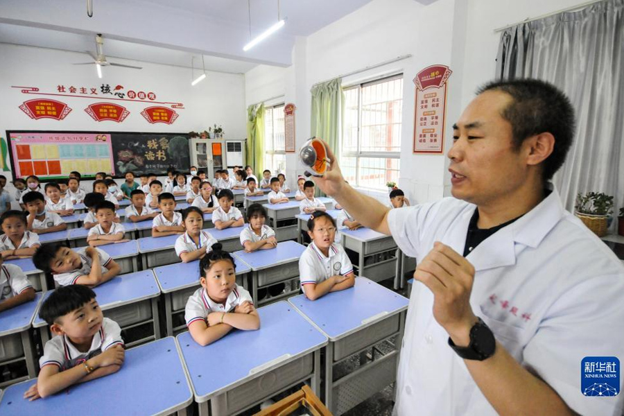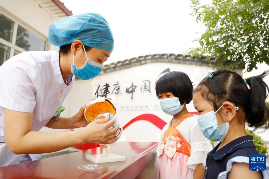 1/06月5日,河北省邢臺市南和區(qū)人民醫(yī)院醫(yī)務(wù)人員深入鄉(xiāng)村開展基層義診活動,為賈宋鎮(zhèn)蘇史張村小朋友講解眼睛的結(jié)構(gòu)和功能。(新華社發(fā) 張馳/攝)
