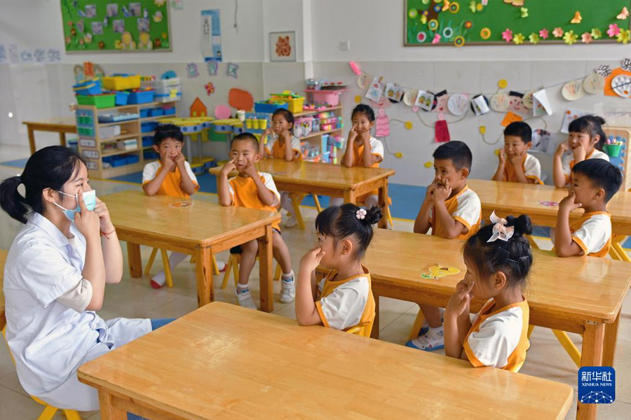 1/06月5日,在山東省煙臺市福山區(qū)一家幼兒園,醫(yī)務(wù)人員指導(dǎo)小朋友做眼保健操。(新華社發(fā) 孫文潭/攝)