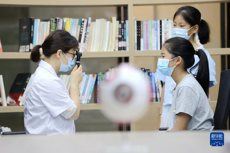 1/06月5日,在浙江省湖州市德清縣武康街道新豐未來社區(qū),醫(yī)務(wù)人員為社區(qū)兒童檢查視力。(新華社發(fā) 謝尚國/攝)