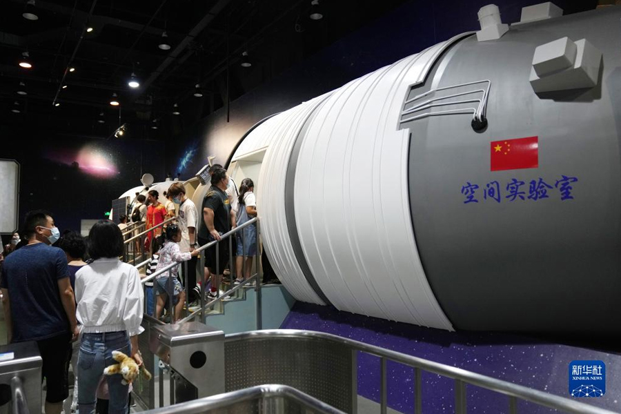 1/08月14日,在中國科學(xué)技術(shù)館,參觀者排隊(duì)參觀神舟飛船和空間實(shí)驗(yàn)室大型仿真模型。(新華社記者 鞠煥宗/攝)