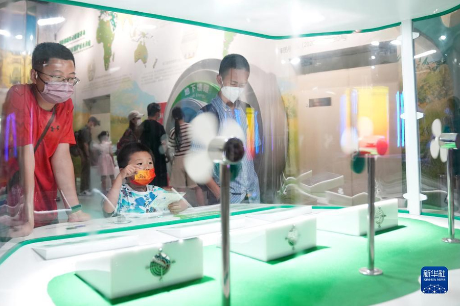 1/08月14日,在中國科學(xué)技術(shù)館,學(xué)生在參觀名為“光伏板的進(jìn)化”裝置。(新華社記者 鞠煥宗/攝)