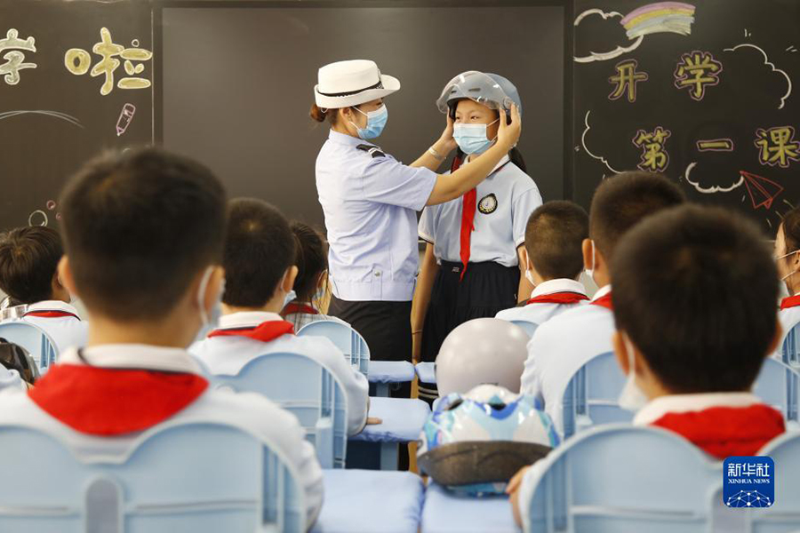1/09月1日,在河北省邢臺(tái)市逸夫小學(xué),交通民警給學(xué)生上交通安全課。(新華社發(fā) 張馳/攝)
