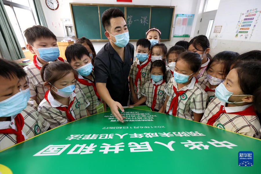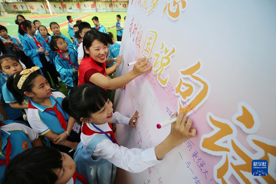 1/09月1日,山東省郯城縣郯城街道龍泉社區(qū)工作者與小學(xué)生一起寫(xiě)下對(duì)祖國(guó)的祝福語(yǔ)。(新華社發(fā) 張春雷/攝)