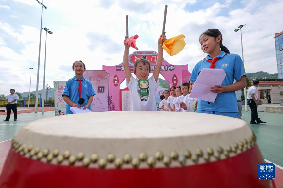 1/09月1日,貴州省黔東南苗族侗族自治州岑鞏縣第四小學(xué)的學(xué)生在“開(kāi)筆禮”儀式上擊鼓許愿。(新華社發(fā) 楊云/攝)