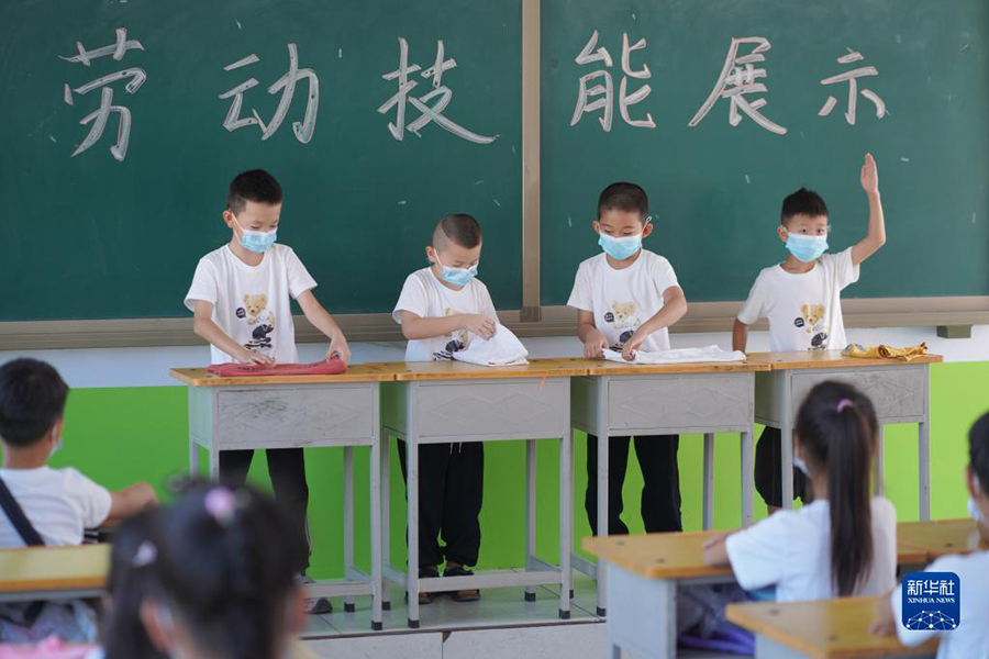 1/09月1日,河北省邢臺(tái)市內(nèi)丘縣西陽(yáng)小學(xué)學(xué)生在開(kāi)學(xué)第一課上比拼勞動(dòng)技能。(新華社發(fā) 劉繼東/攝)