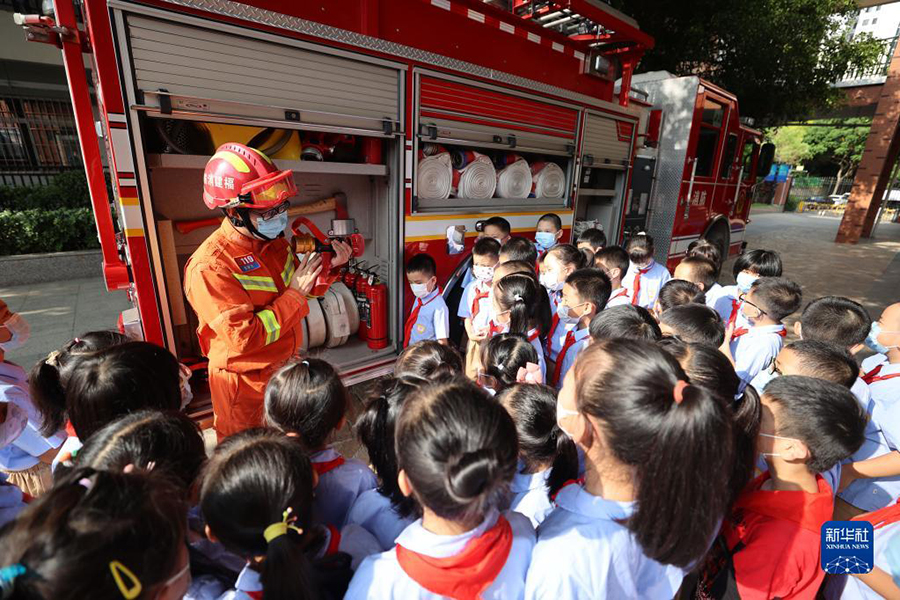1/09月1日,在福建省廈門(mén)市金安小學(xué),消防員向小學(xué)生們講解消防器材裝備的使用方法。(新華社發(fā) 曾德猛/攝)
