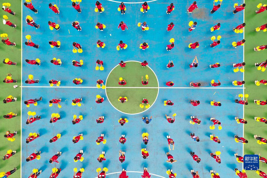 1/09月1日,貴州省貴陽(yáng)市開(kāi)陽(yáng)縣第一小學(xué)學(xué)生在跳自編舞《天天向上》(無(wú)人機(jī)照片)。(新華社發(fā) 袁福洪/攝)