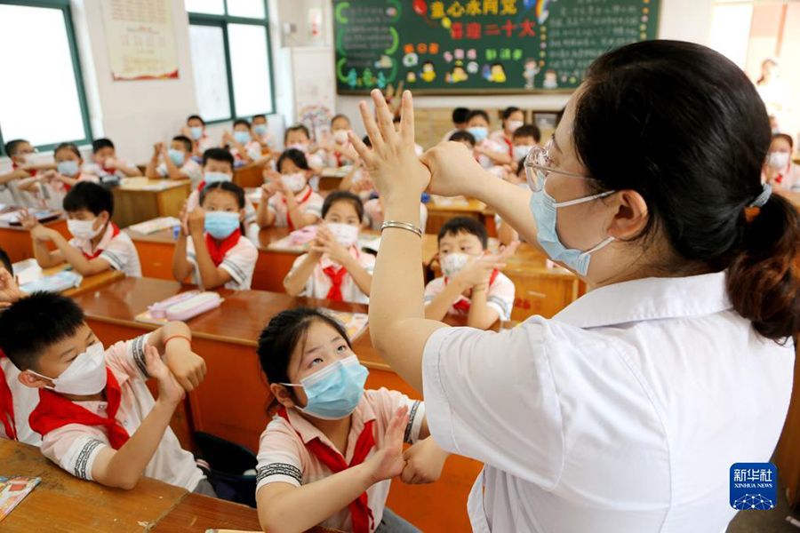 1/09月1日,在江蘇省連云港市院前小學(xué),校醫(yī)給學(xué)生講解正確的洗手方法。(新華社發(fā) 王春/攝)