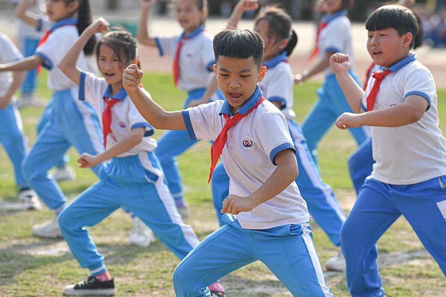 2月13日,海南省屯昌縣新興中心小學學生在演練武術。(新華社記者 蒲曉旭/攝)