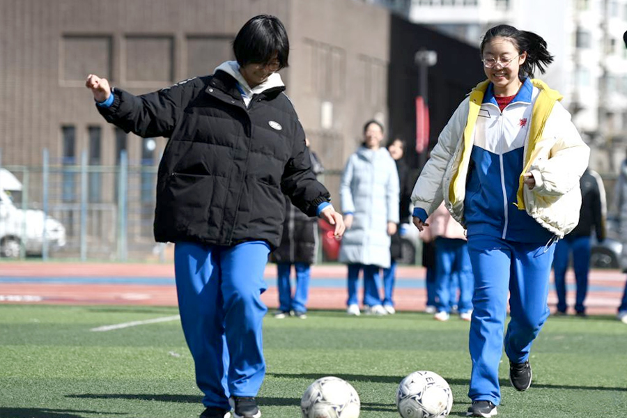 2月13日,天津市耀華中學學生在體育課上踢足球。(新華社記者 趙子碩/攝)