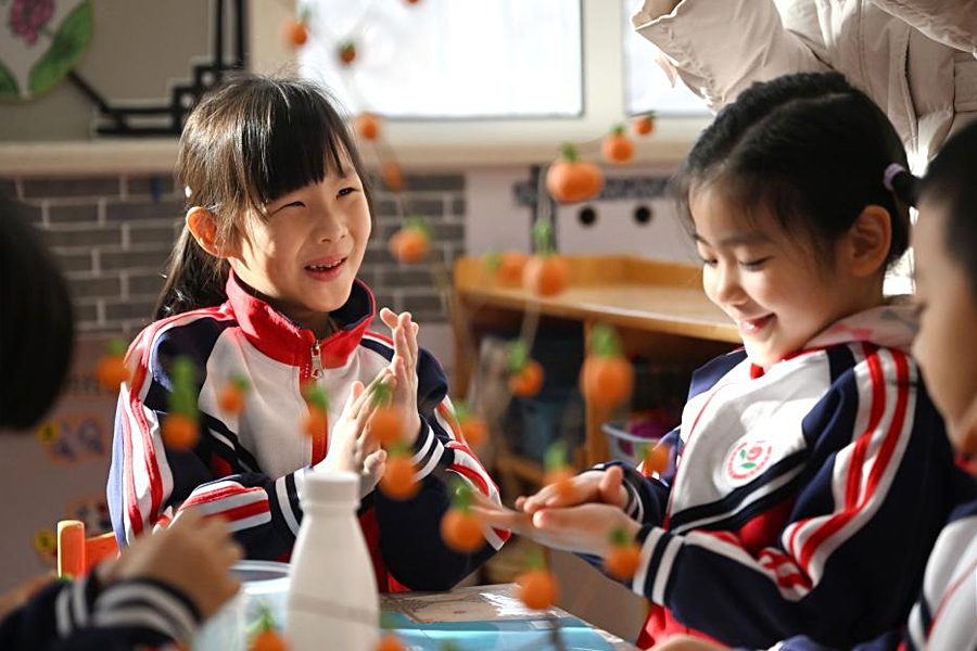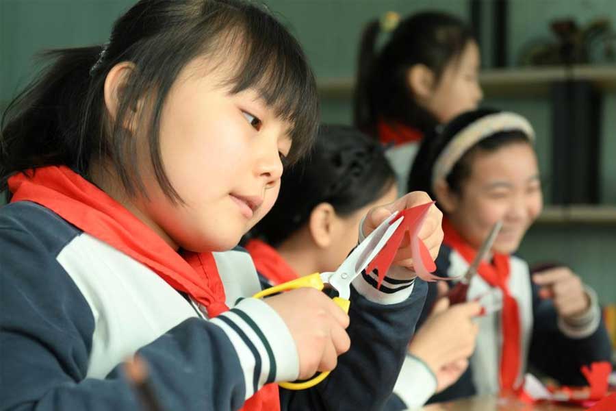 2月13日,天津市和平區(qū)第五幼兒園的小朋友在學習手工制作。(新華社記者 趙子碩/攝)