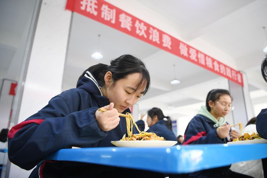 2月13日,寧夏育才中學學生在食堂懸掛的“光盤行動”橫幅前就餐。(新華社記者 王鵬/攝)