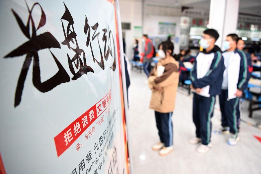 2月13日,寧夏育才中學學生在食堂擺放的“光盤行動”公益廣告前排隊。(新華社記者 王鵬/攝)