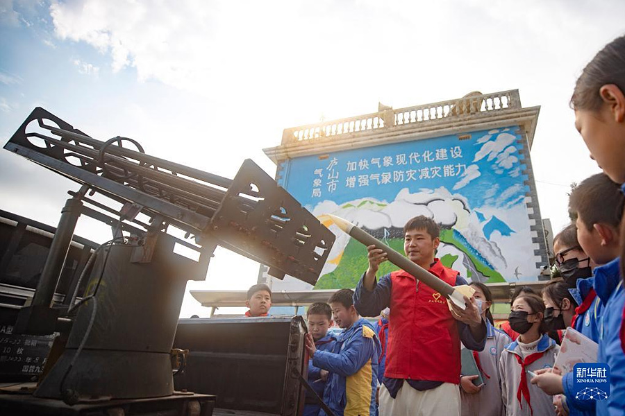 1/03月22日,在江西省廬山市,氣象局工作人員向小學生介紹人工增雨設(shè)備。(新華社發(fā) 韓俊烜/攝)