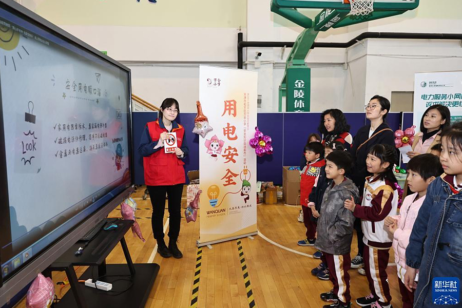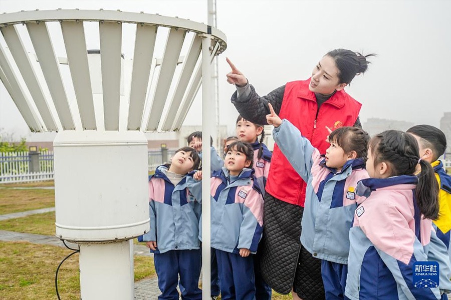 1/03月22日,在浙江省湖州市長興國家氣象觀測站,科普志愿者向龍山街道中心幼兒園的孩子介紹氣象設(shè)備知識。(新華社發(fā) 吳拯/攝)