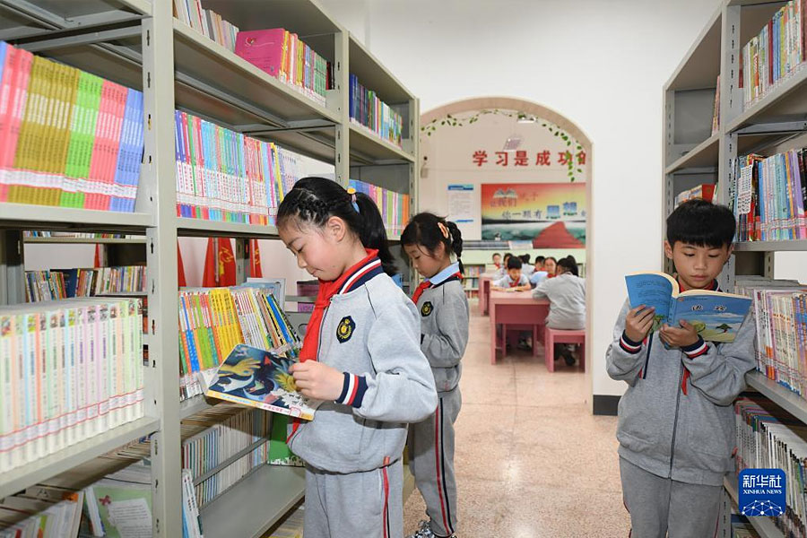 1/04月19日,吳興區(qū)第一小學(xué)的學(xué)生們?cè)趫D書(shū)館借閱書(shū)籍。(新華社記者 翁忻旸/攝)