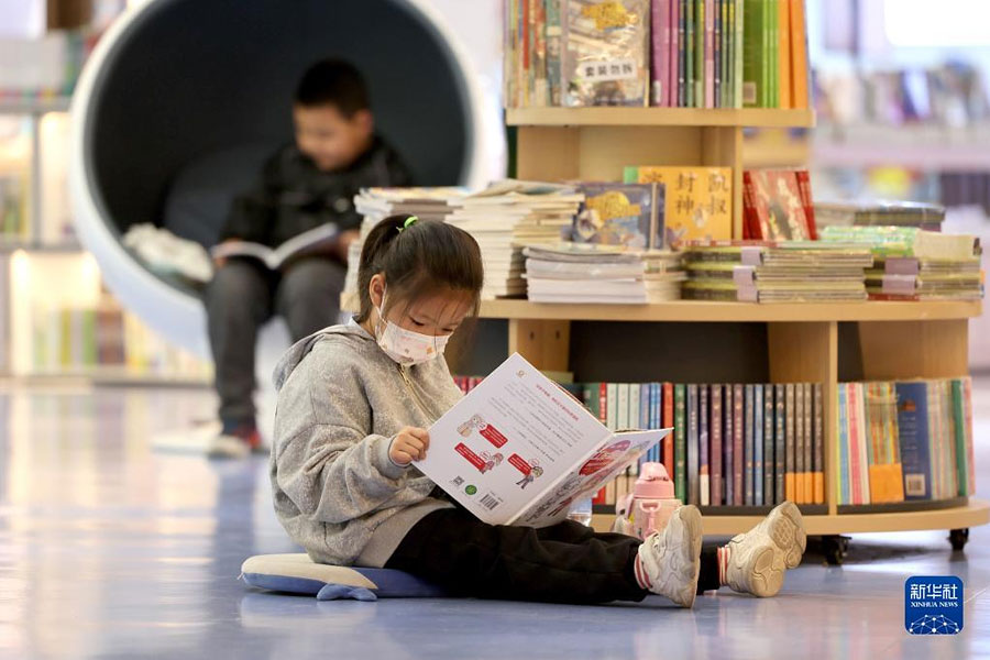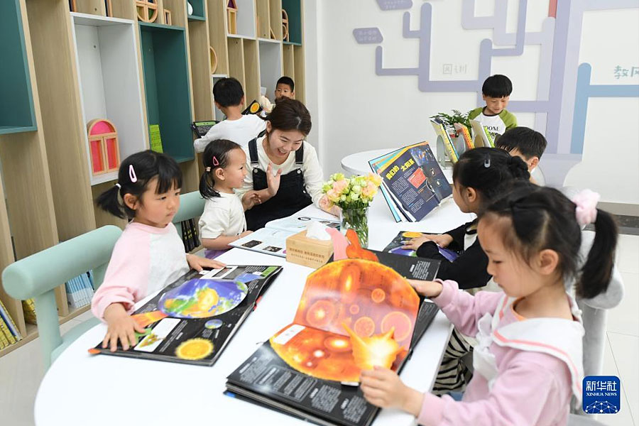 1/04月19日,吳興區(qū)八里店鎮(zhèn)中心幼兒園的老師帶著孩子們?cè)跁?shū)吧閱讀繪本。(新華社記者 翁忻旸/攝)