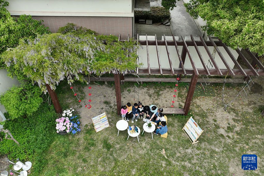 1/04月19日,吳興區(qū)八里店鎮(zhèn)中心幼兒園的老師帶著孩子們?cè)谧咸偌芟麻喿x(無(wú)人機(jī)照片)。(新華社記者 翁忻旸/攝)