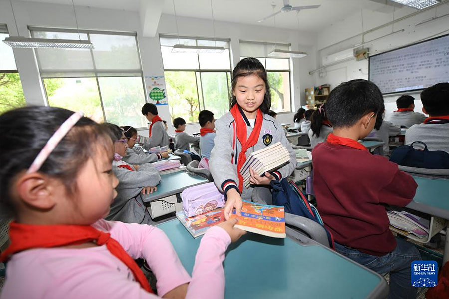 1/04月19日,吳興區(qū)第一小學(xué)的學(xué)生分發(fā)課外書(shū)。該校實(shí)行班級(jí)圖書(shū)借閱制度,每周為學(xué)生換一批課外書(shū)。(新華社記者 翁忻旸/攝)