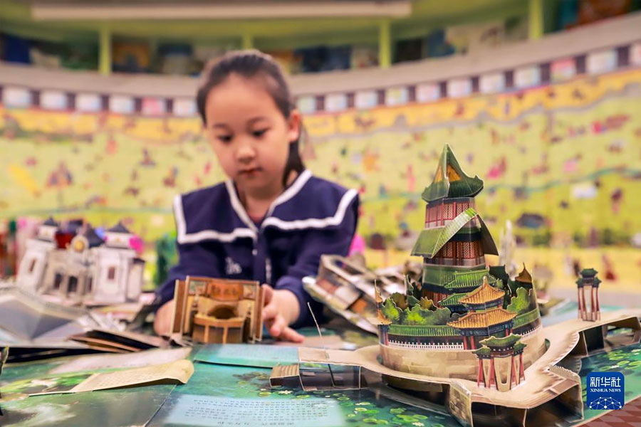 1/04月22日,一名小朋友在河北省遵化市一家書店翻看立體書。(新華社發(fā) 劉滿倉/攝)